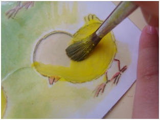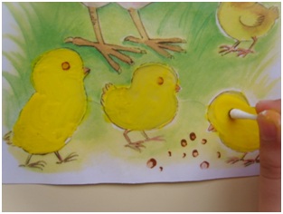 4. Получилась картинка с исчезнувшими цыплятами. Чтобы их вернуть, необходимо закрасить прозрачные силуэты густой гуашью, или залепить кусочками пластилина, кусочками жёлтой салфетки или помазать клеем и засыпать цветным песком – вариантов много!