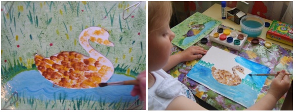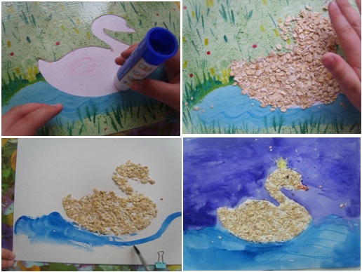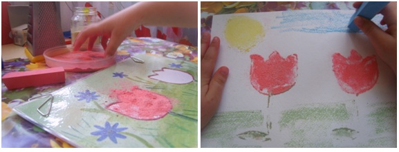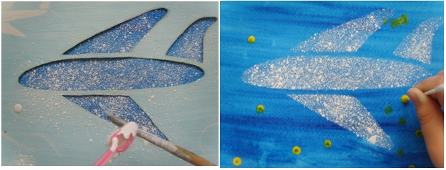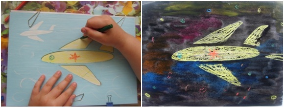 по трафарету свечой, сильно нажимая. 2. Раскрашиваем весь рисунок акварелью.
