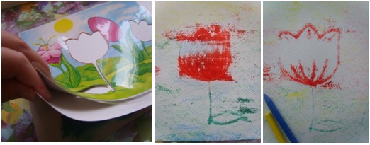 трафарету обводим восковым мелком. 2.Весь силуэт заливаем